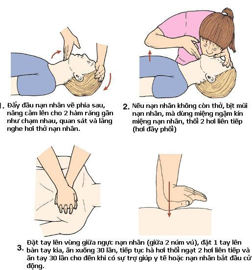 + Nếu lồng ngực không chuyển động tức là nạn nhân ngưng thở, hãy thổi ngạt miệng qua miệng. Sau đó kiểm tra mạch cổ, mạch bẹn xem có đập không; nếu không bắt được mạch tức là nạn nhân đã ngưng tim, phải ấn tim ngoài lồng ngực ở nửa dưới xương ức. Phối hợp ấn tim và thổi ngạt liên tục trên đường chuyển nạn nhân tới cơ sở y tế.